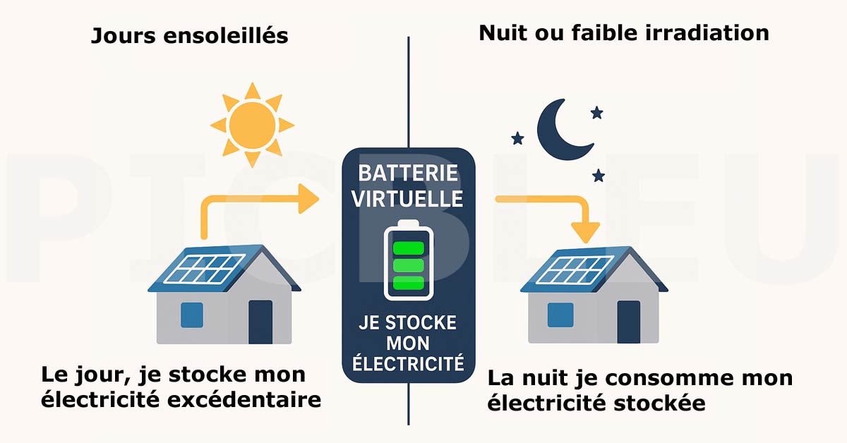 C'est l'une des solutions les plus plébiscitées. Elle propose un stockage virtuel sans limite de temps. Vous payez un petit abonnement mensuel (environ 1€ HT par kWc installé).